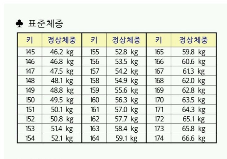 위 사진은 한 일본잡지에 소개되어관심을 끌었던 키 별 '미용체중'입니다. 여성 기준으로 나왔네요.